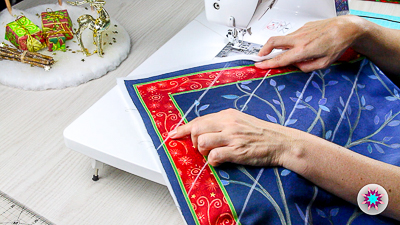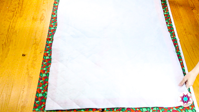9. El siguiente paso, es colocar la tela trasera al tapete y para ello colocamos el panel boca abajo. Luego pasamos la máquina de coser por todo el contorno.