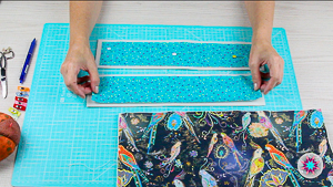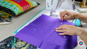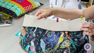 7. Ya en la máquina de coser, vamos a unir la tela secundaria al cuerpo del bolso y luego lo cosemos con la máquina y las pinzas también.