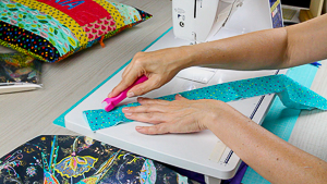 10. Ya vamos a empezar a preparar las asas del bolso. Lo primero será doblar la tela dejando el revés en el interior y le pasamos el rodillo y por último pasamos un pespunte con la máquina de coser.