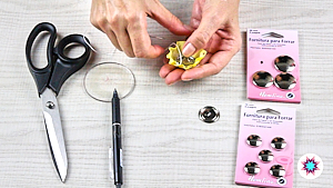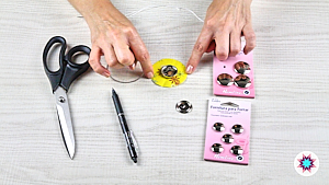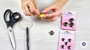 - Por último, colocamos la pieza trasera del botón presionando en la parte donde acabamos de coser la tela.